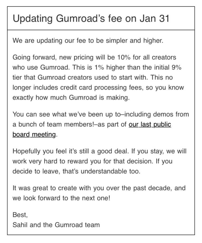 So Gumroad’s change here isn’t just a simple single percentage point increase, it means they’re taking a flat 10% from sales where they might have only taken 5% before, on top of the credit card processing fees, which sellers will still have to pay. Essentially, while they’re not outright lying about the rate hike here, they’re carefully and creatively undermining the severity of it. If you’re a Gumroad seller, beware.