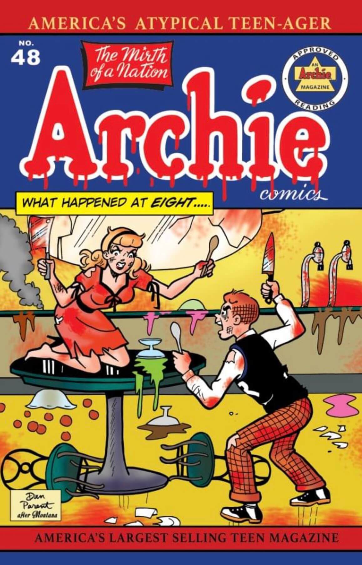 A final Parent variant for Pop’s Chock’lit Shoppe of Horrors #1 is set to be released through his My Bargain Comics website. It pays tribute to Archie Comics #48. This variant is limited to 250 copies and features the original cover on the back. It is available for pre-order now and is expected to be in by mid-March. Each comic costs $27.99 and is also available in bundles with damaged covers leftover from Parent’s wares.