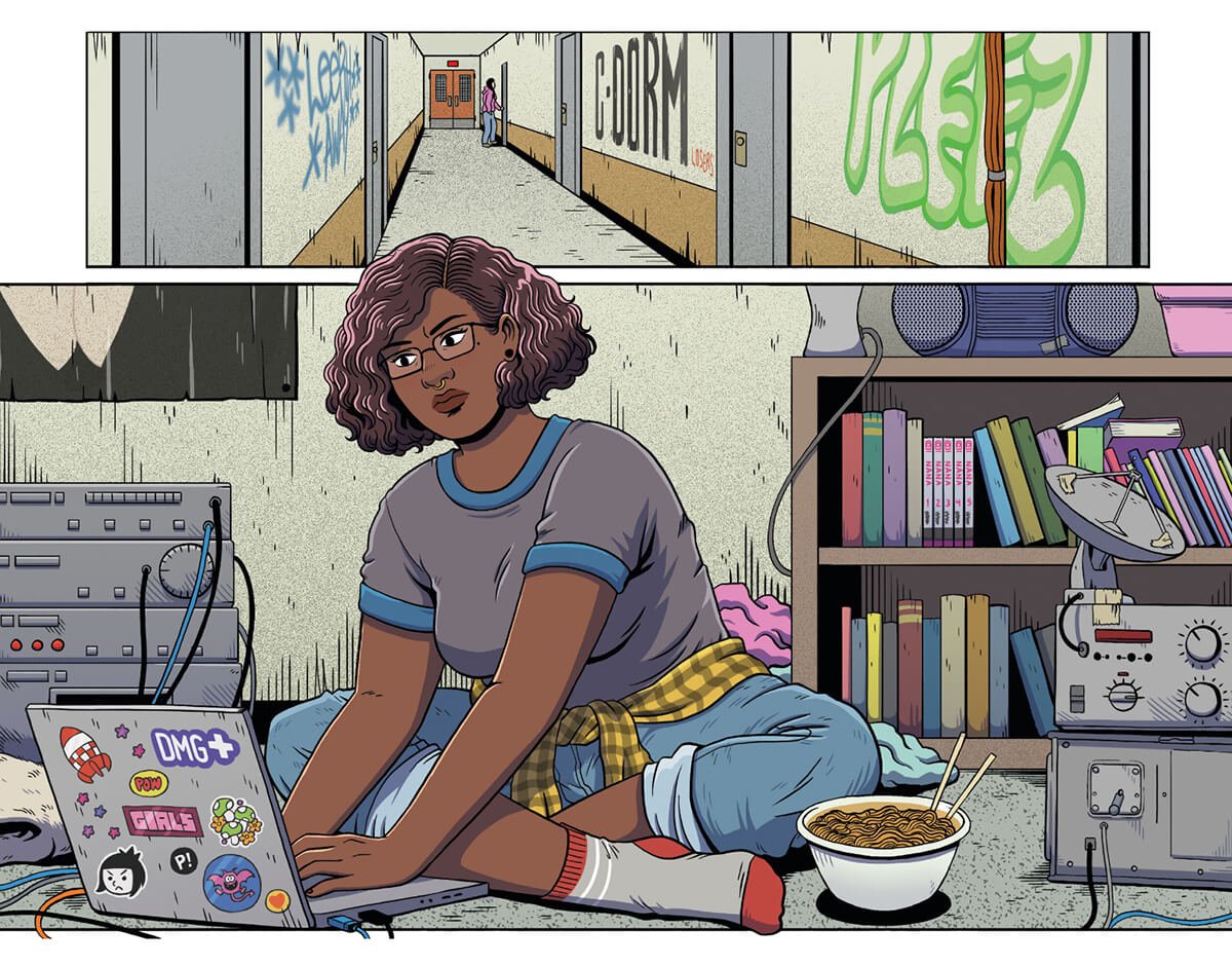 The visual aesthetic of Space Trash screams the early 2000s like a punk anthem. The bright colors work well together while almost-but-not-quite clashing, creating a thrilling sense of energy reflected in the bold actions of the teenage characters. As full of life as these characters are, their environments are equally compelling. The physical edition of Space Trash is almost a foot tall, a format which gives the reader ample opportunity to study the painstakingly drawn details of the panel backgrounds. The environment is a treasure trove of pop culture references ranging from book titles to anime stickers to the quaintly archaic error codes that appear on Una’s laptop screen as she attempts to connect to off-lunar networks.