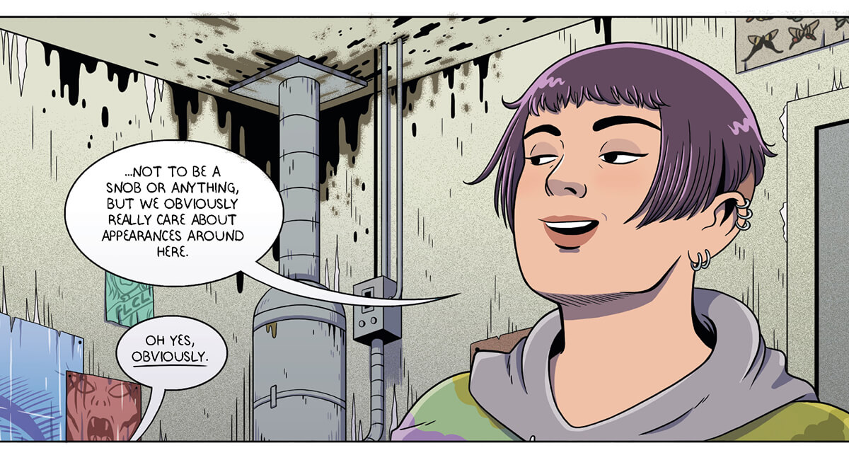 Many of these questions will hopefully be answered in subsequent installments of the series, but the open-ended story introduced in the first volume prompts reflection on the real world, which is definitely not the future we were promised back when the pop-punk aesthetic was trendy. Teenage readers will perhaps relate most intimately to the characters, but Space Trash is compelling for people well past high school. The subtle but deliberate sense of nostalgia evoked by the cultural references embedded in the art effectively asks: Do you remember what it was like to be sixteen and convinced that you could fight the system? Did you grow complacent as you grew older? Was it worth it?