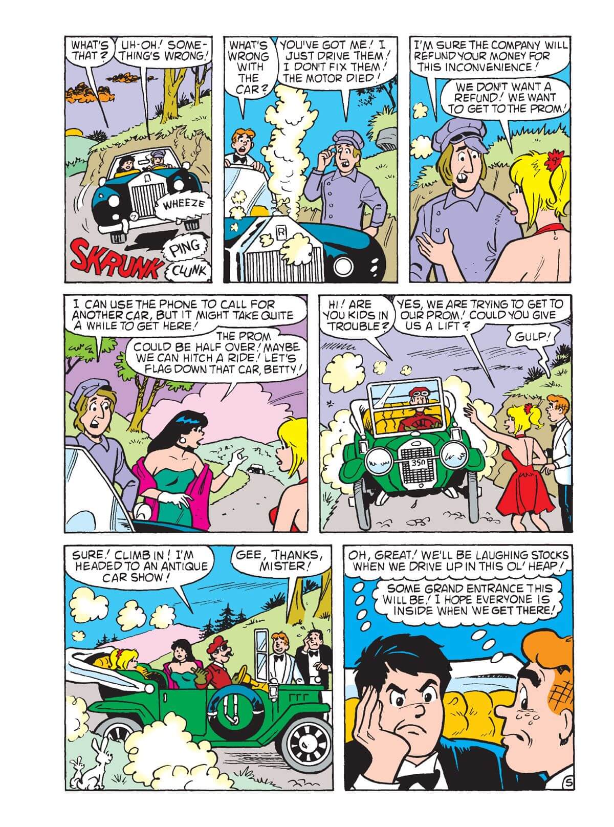 Below, you’ll find the first two pages of Ginger’s Ails, as well as the full story Grand-Slammed Entrance. In the latter tale, the gang’s prom preparations turn disastrous. Everyone’s making a fancy entrance in some rented vehicles, but Reggie and Archie’s pick ends up overheating, leaving them stranded with their driver, Betty and Veronica. Ginger’s Ails features the writing talents and art of Dan Golliher. Jim Amash provides the inks, Glenn Whitmore the colors, and Jack Morelli the lettering. Grand-Slammed Entrance features writing from Mike Pellowski, art by Dan DeCarlo, inks by Alison Flood and letters by Bill Yoshida. World of Betty and Veronica Jumbo Comics Digest #25 hits streets on May 10.