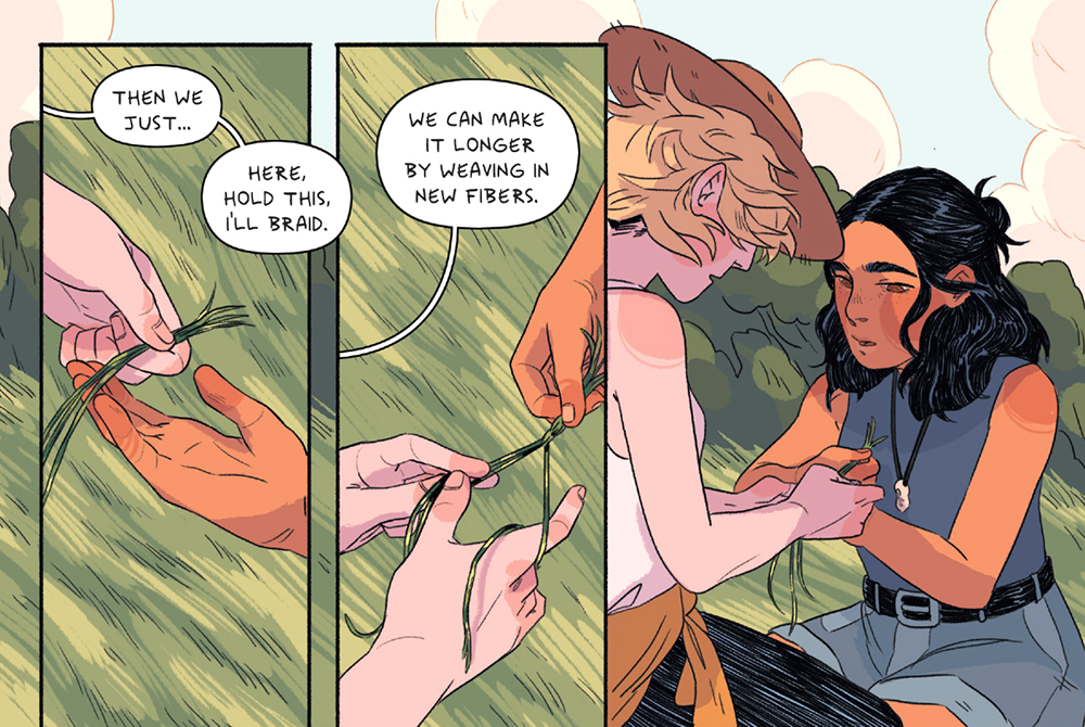 Sas Milledge’s graphic novel Mamo embraces the cottagecore aesthetic. Its pages are filled with lush rural landscapes, small magical adventures, and quaint witchcraft traditions. At the same time, Milledge directs a challenge toward the concept of “tradition” by showing how a conservative mindset can hurt people who don’t fit neatly into models established in the past. By following two young women through a complicated friendship that blooms into a queer romance, Mamo tells a bittersweet story about family and belonging that acknowledges how difficult it can be to come home.