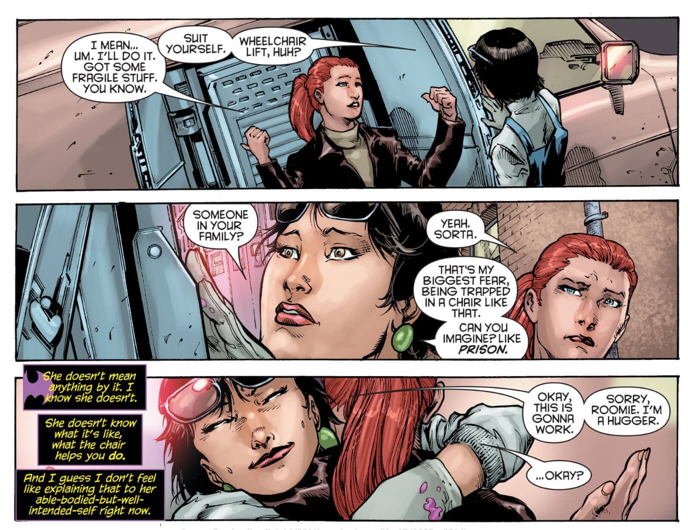 In the DC Rebirth, also called the New 52, the aftermath of The Killing Joke is retconned and altered. In the new history, three years after her injury and subsequent paralysis, Barbara is offered the chance to participate in an experimental surgery. The surgery would implant a chip in her spine that would bypass her damaged nerves and allow her to walk again. This happens right in the very first issue of the new 2015 Batgirl series from Gail Simone, Ardian Syaf, Vicente Cifuentes, and we actually get a very interesting interaction between her and her roommate, Alysia Yeoh. In it, Barbara is still driving her wheelchair accessible van, which Alysia sees. Alysia asks if it’s for someone in her family and Barbara lies and says yes. Alysia then says the oft-heard refrain of, “I could never live like that!” after seeing the wheelchair ramp in Barbara’s van. Barbara even uses the term “able-bodied” in describing her dismay at Alysia’s insensitive remark, thinking to herself, “I don’t feel like explaining that to her able-bodied-but-well-intended-self.”