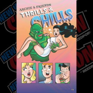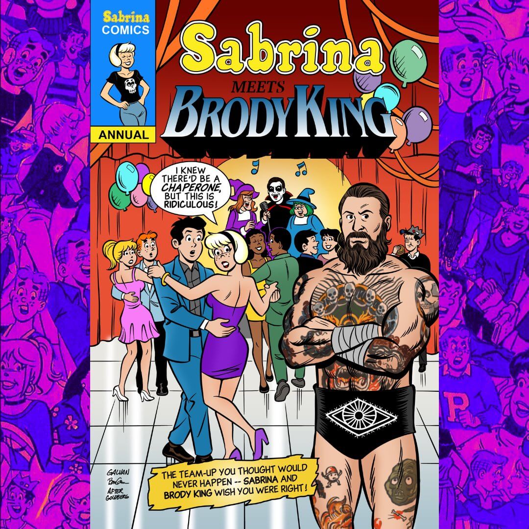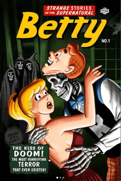 The next set of issues comes from Mellow Fellow Trading.  The first cover is a Tomb of Dracula tribute by Dan Parent that covers Chilling Adventures Present: Return of the Chilling Adventures in Sorcery #1. It’s limited to 25 foil variants at $20 each, 12 color shift foil variants at $35.00. The covers for the first variant were offered at New York Comic Con but are now available here. Mellow Fellow are also offering a set of variants for Chilling Adventures Present: Chilling Adventures of Salem #1. I can’t find information on the artist on their webpage or social media, but there are 20 foil copies of the issue available for $2o,  20 virgin foil copies for $20, and 15 color shift foil copies for $35. There’s also a Creature from the Black Lagoon tribute cover from Dan Parent that covers Archie and Friends: Thrills and Chills #1. The foil variant is limited to 25 and goes for $20, and the color shift variant goes for $35 and is limited to 12. Next up is this Bill Galvan EC Horror tribute cover, which covers Betty and Veronica Beach Party #1. It’s limited to 150 copies, a combined lot of virgin variants and trade, each going for $12. There are also 35 foil variants, 20 distressed metal and 15 distressed virgin metal issues.  The foil variants are only available in packages at $55 each. This set of flashback covers – drawn by Sajad Shah – were created for New York Comic Con and cover Chilling Adventures Presents: Welcome to Riverdale #1. There’s no word at press time how many of each variant exist. Next up is this Corpse Bride tribute which covers Archie’s Halloween Spectacular #1. Drawn by Scott McFarland and Ken Berube, it’s limited to 200 virgin covers, 31 foil covers, 10 metal covers, 3 wood covers, 3 gold metal and 1 blue marble cover. The issue is set to be released on October 22. Bill Galvan and Archie Comics meet professional wrestlers Danhausen and Brody King in the next two covers, which cover an unspecified comic and have an unspecified release limit. Then there’s Bill Galvan’s Demons Slayer homage, which covers  Chilling Adventures Presents: The Cult of that Wilkins Boy. It’s limited to 125 copies, comes with a COA and goes for $10.