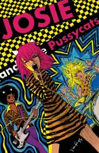 The Pussycats - Josie McCoy, a thin white redhaired teenager, Melody Valentine, a thin blonde haired teenager, and Valerie Brown, a thin black brown-haired teenager, enthusiastically play their instruments while balanced on a purple platform. Melody wears a green top, Valerie sports a hot pink mini dress, and Josie wears a leopard-print body suit and black pumps. They are surrounded by blue notes and a purple and royal blue starburst.