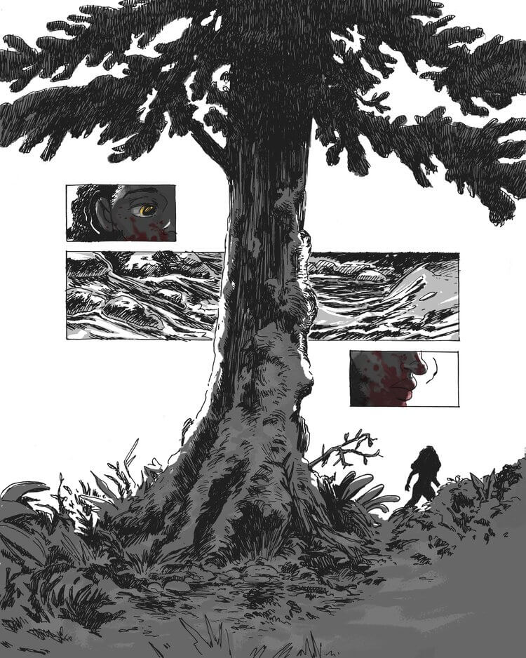 And in the next page, we see our first glimpse of the woman we will soon learn is Marta. She’s there, in a silhouette far off on the right side of the page, hair unbound and body naked, seemingly. A large tree takes up most of the space on the page, splitting it down the center. Two small panels, both separate on either side of the tree, show a close-up: one of her darker face, revealing a yellowish eye with a hint of blood. The second small panel is a close-up of her mouth, blood splattering the bottom half of her face. These two panels have the only color on the page, and that is how Marta is introduced–she’s moving, on the go and looking for something.