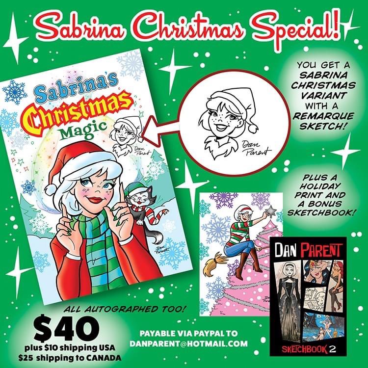 Dan Parent recently posted this exclusive offer for Sabrina’s Holiday Special #1. You can get a hand-remarqued exclusive cover by emailing him at danparent@hotmail.com. Each issue costs $40 with $10 surcharged shipping, and $25 to Canada. Comes with an additional holiday print and sketchbook.