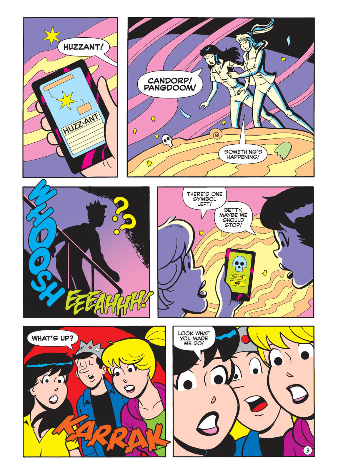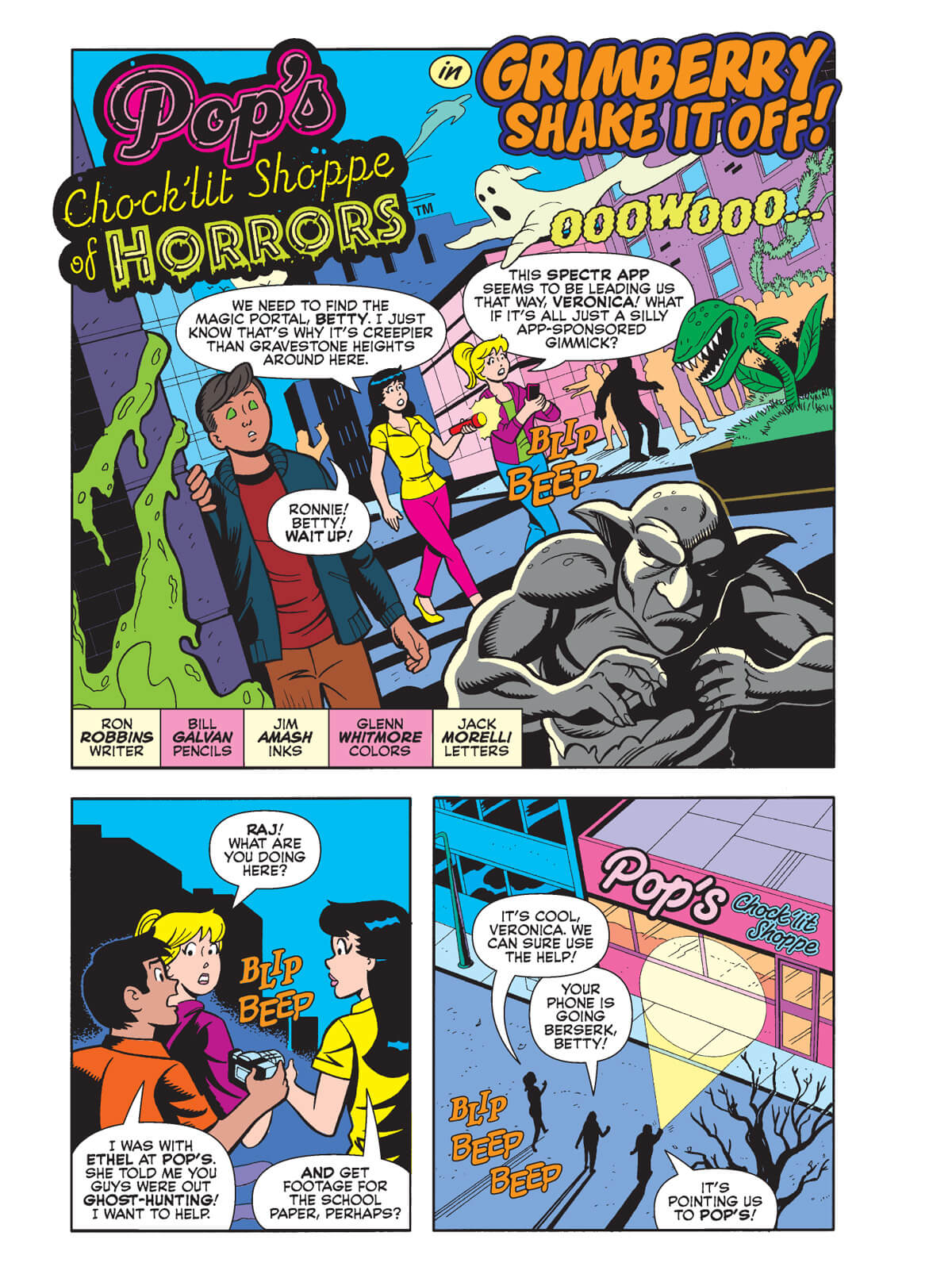 Never let it be said that Riverdale’s weirdness is solely exclusive to…well, Riverdale. Betty and Veronica Jumbo Comics Digest #321 indulges in a kid-friendly version of Pop’s Chock’lit Shop of Horrors when Betty and Veronica team up with Raj after a ghost-hunting expedition leads to a portal between worlds opening at Pops. This two-page preview below hints at the spooky goings-on to come; but can Betty and Veronica fix things before it’s too late?