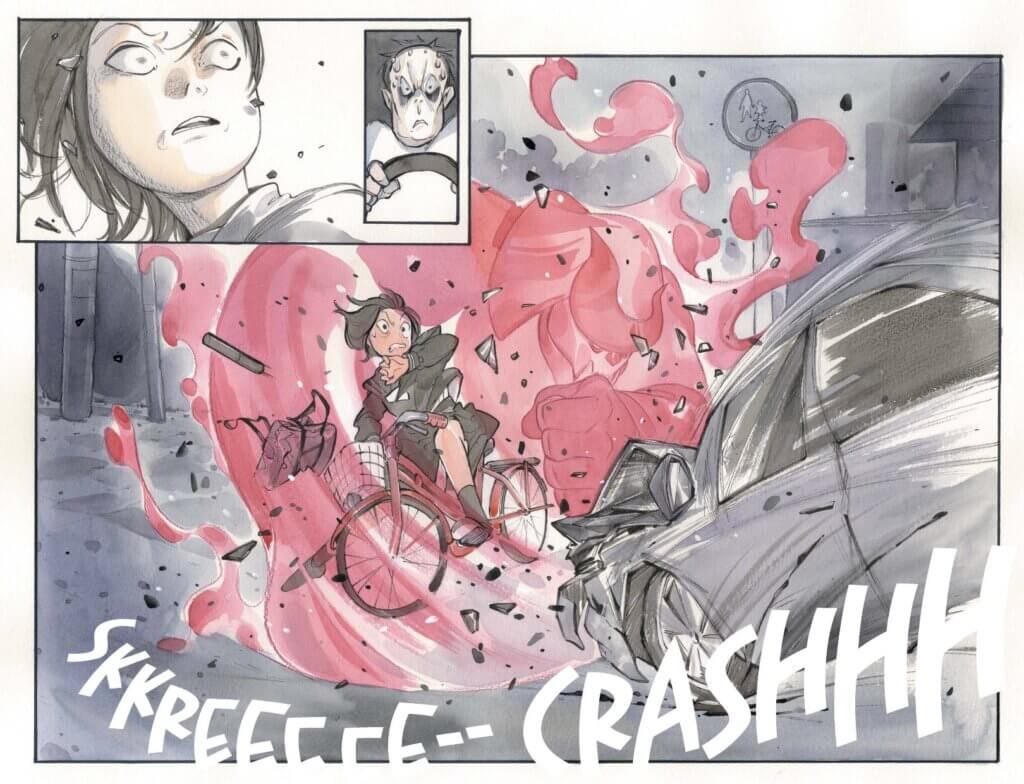 Momoko’s use of color is also critical to the tone and flow of the story. During the scene where the strange specter accosts Hisako at the temple, Momoko paints in increasingly oppressive pigments of gray and black. When the armored suit finally materializes across a two-page spread, its vibrant red and pink form is a heroic shock to the senses.