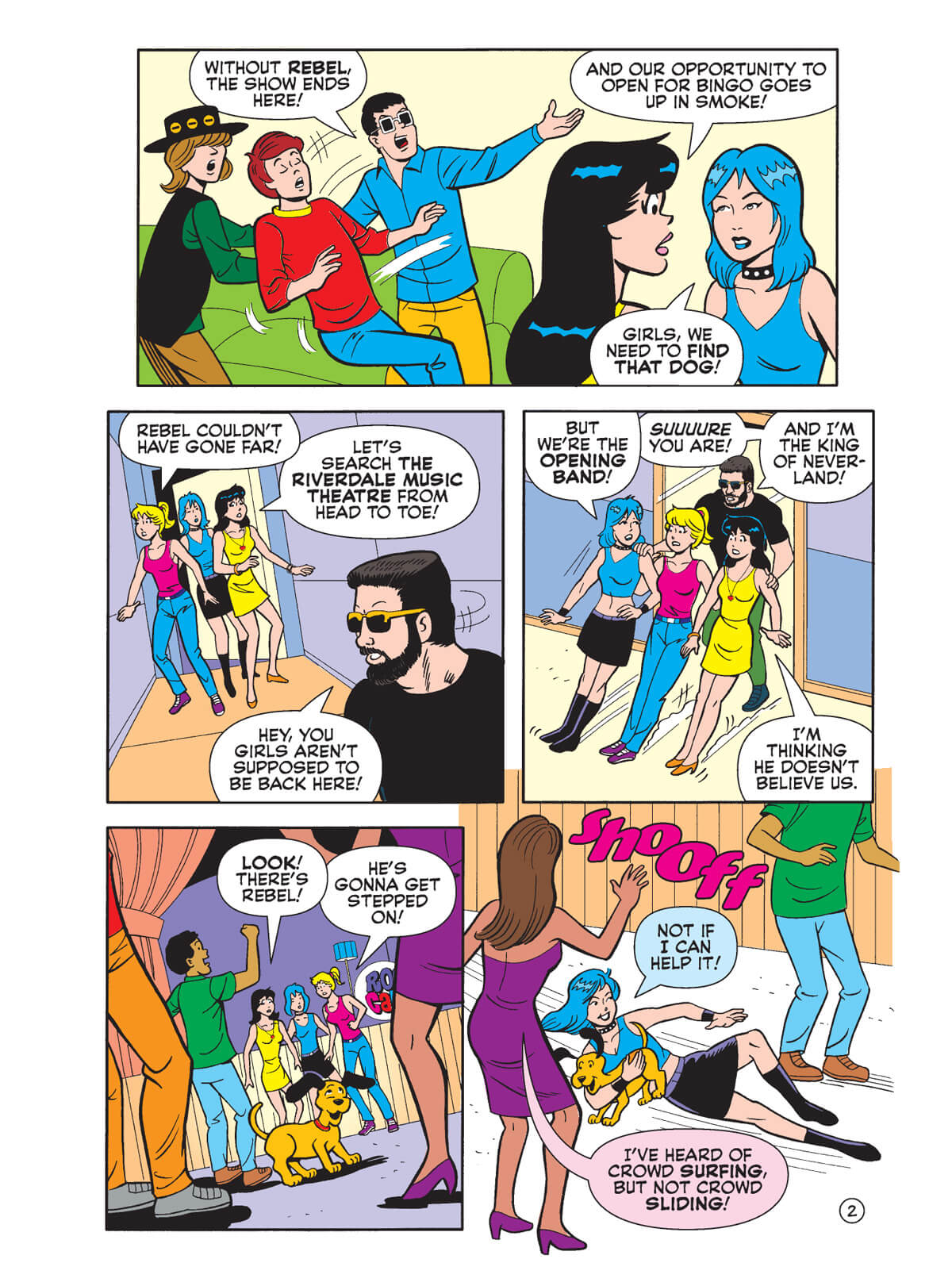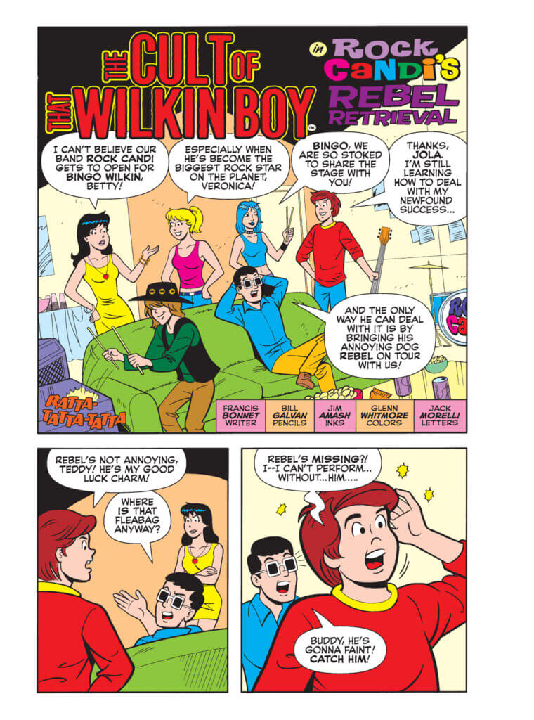 Bingo Wilkin has finally hit the big time, and he’s spreading along his good fortune to several lucky Riverdalians. In Betty and Veronica Jumbo Comics Digest #323, Rock Candi — Betty and Veronica’s band with Jola Kitt — has scored the plum opportunity of opening for the world’s biggest musician. But when Bingo learns his pup, Rebel, has gone missing, he nearly faints! Now Rock Candi’s on a mission to save the dog and their gig!