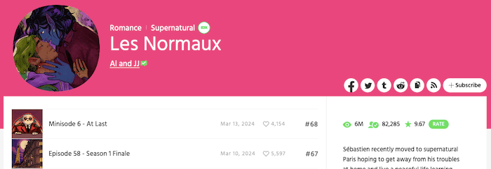 The Webtoon banner for Les Normaux, with an icon showing Sebastien and Elia in a loving embrace.