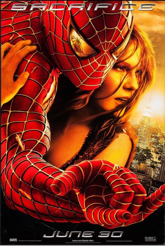 Spider-Man 2 one pager poster, featuring Spider-Man holding Mary Jane, his hand out and poised to shoot web. The word 'Sacrifice' runs across the top and 'June 30th' underneath.
