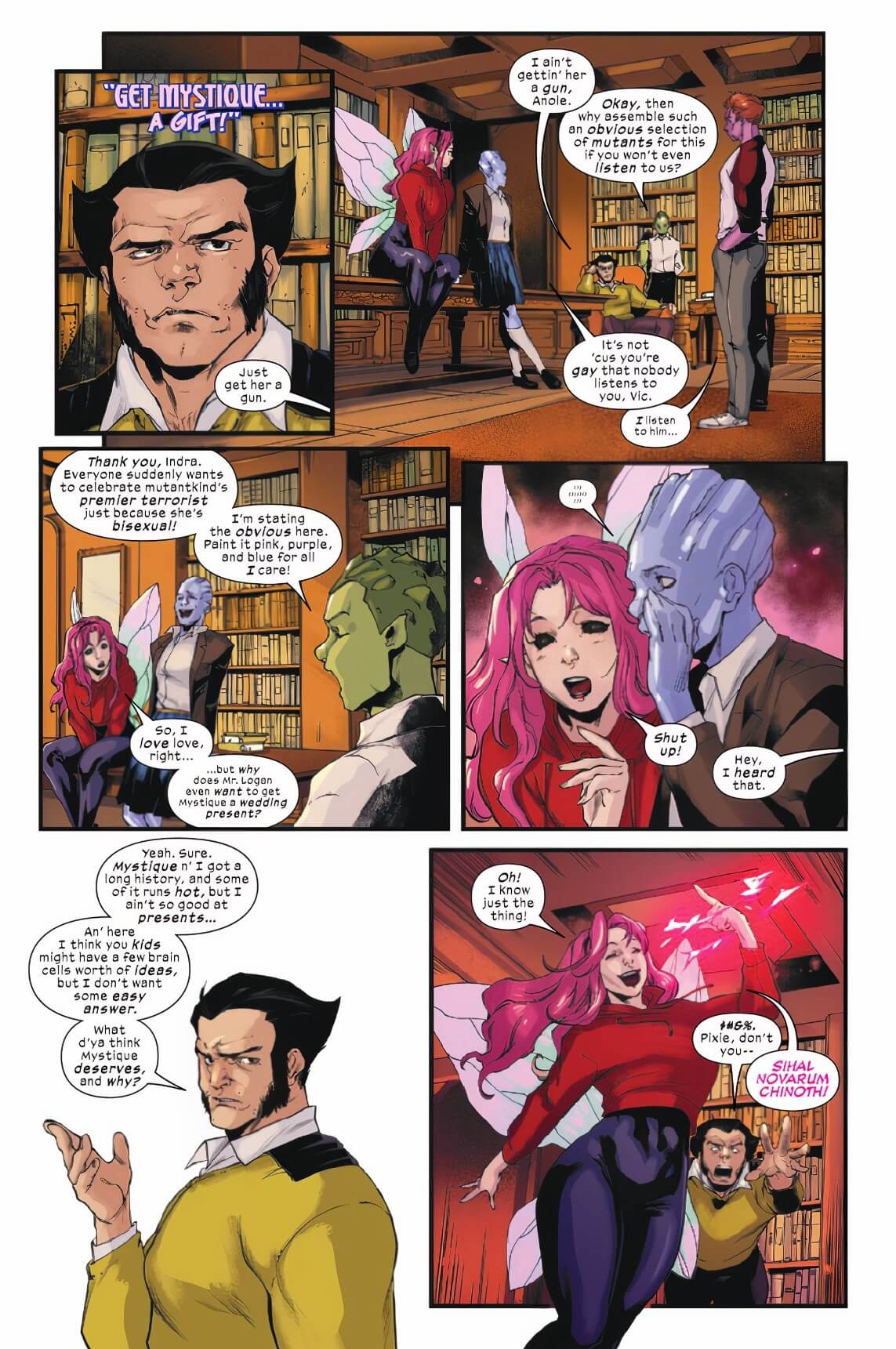 Still, this is really about Wolverine playing a teacher, so we get some scenes of Pixie, Bling!, Anole and Indra suggesting outlandish gifts that involve highly dangerous settings such as Limbo or The Savage Land … before Wolverine settles on his original thought. It’s at least charming and I do like the note by the creators thanking teachers in real life who nurture queer students.