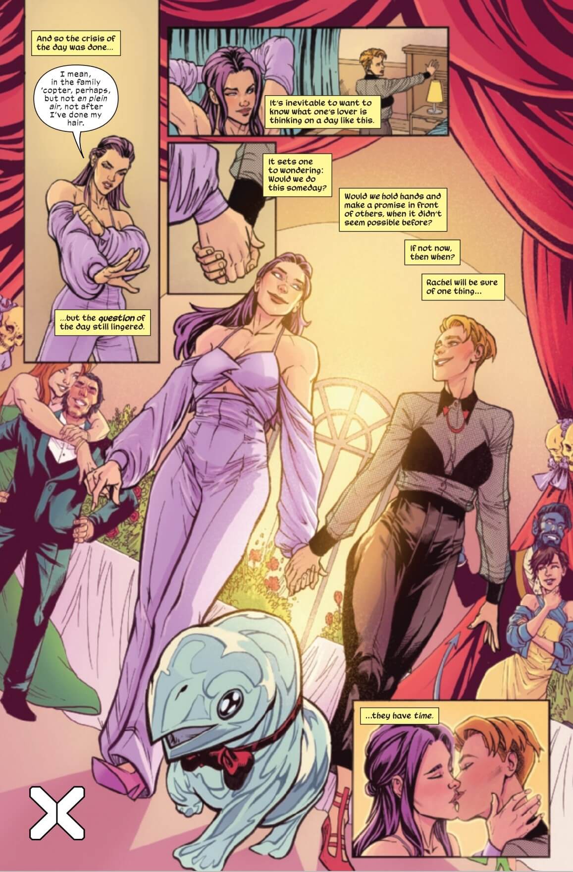 Kayleigh: X-Men: The Wedding Special has some of the most diverse styles we’ve seen in one of these themed issues, so I must tip my fascinator to the artists. Can I just say: pants! Women in pants! I love women in pants at weddings! Phillip Sevy puts a fashionable spin on Betsy’s classic 1980s costume with bare shoulders and purple bell sleeves, and Rachel looks sharp and daring in a black sheer top with red Phoenix collar pins. And I love, love, love (underline that three more times) that Rogue is wearing a fashionable suit and tie (as drawn by Stott and Jenn St. Onge) to her moms’ wedding instead of being vacuum-sealed into a tiny tube dress.