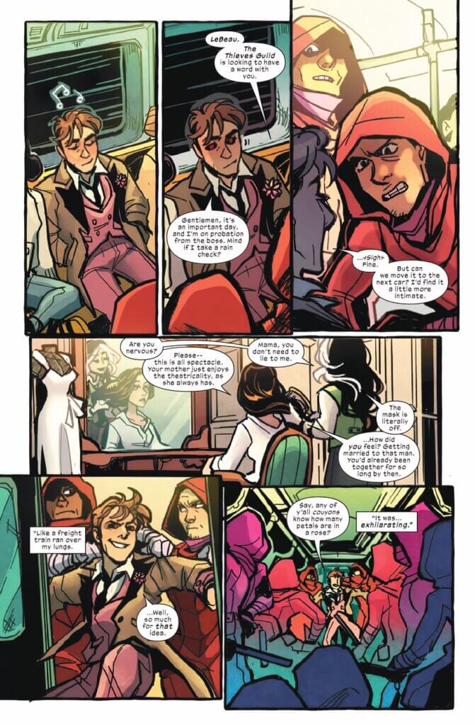 Rebecca: The last story-within-a-story involves Rogue having a heart-to-heart with Destiny while Gambit gets on the subway to go to the wedding without his cards and has to fight off The Thieves Guild with the petals on his boutonniere. This was my favorite, not only because Gambit doing that is funny, but as the daughter of a gay man this hit me right in the heart. Also, it’s a nice callback to previous wedding issues, not only Rogue’s wedding to Gambit, but also Rogue wistfully wishing that Mystique and Destiny could marry back when Northstar and Kyle Jinadu tied the knot.
