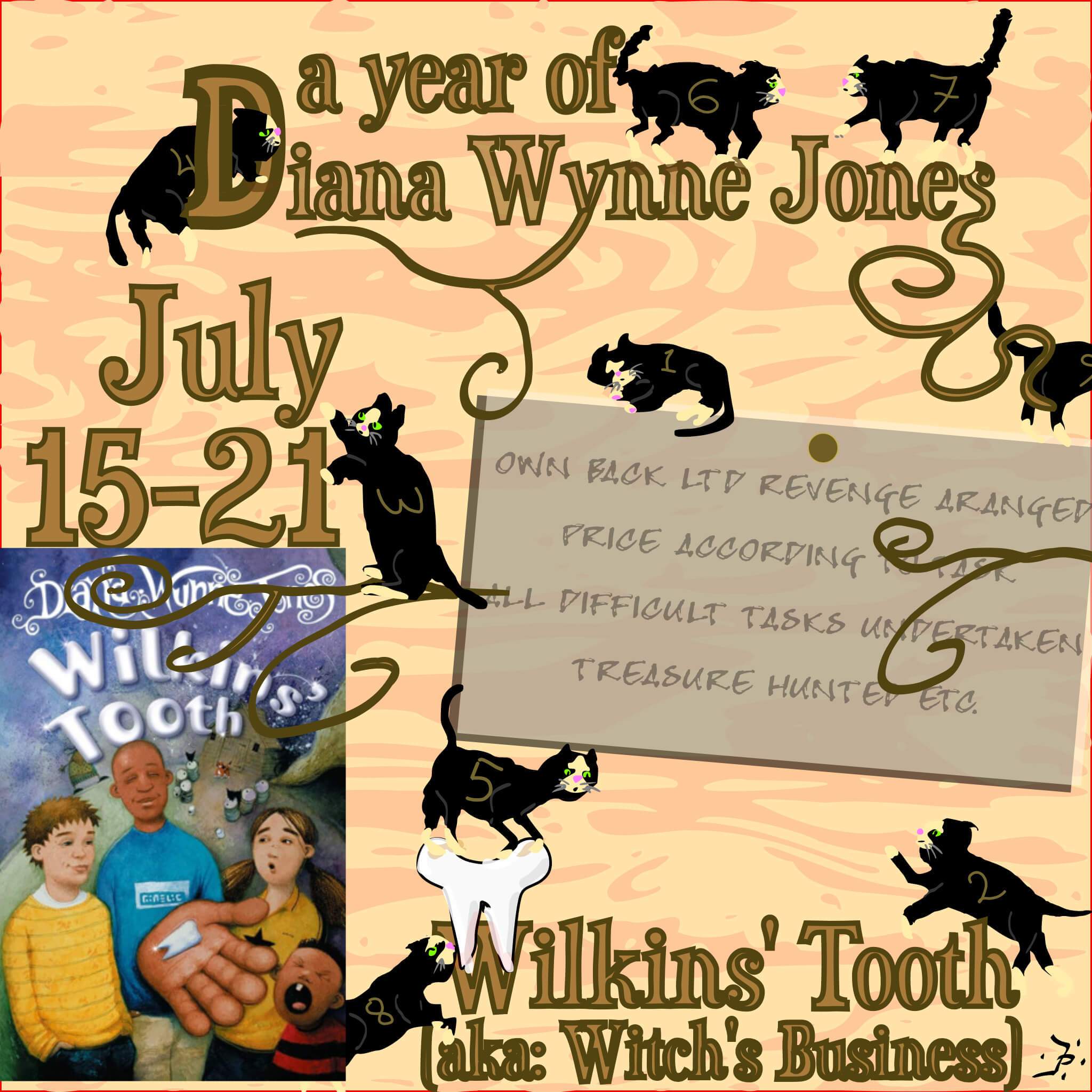 This custom image by Marnanel Thurman shows the dates we read this book, the title and the series title, "A Year of Diana Wynne Jones," with the cover of one edition of the book. Black cats cavort around the words and images.
