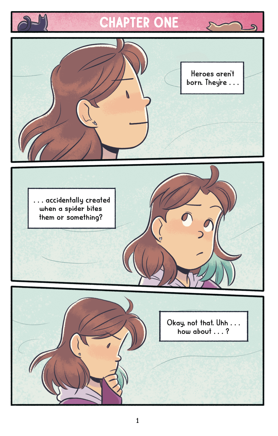 The cover of the fourth volume of Katie the Catsitter by Colleen AF Veneble and Stephanie Yue shows some of our human and cat characters noticing the shadow of a costumed figure against a purple backdropIn the Katie the Catsitter books, our title character starts catsitting for an upstairs neighbor’s many, many cats, only to discover that she is a notorious supervillain. However, her neighbor is really an unsung hero, using “villainous” tactics to expose corruption in powerful corporations and institutions. Katie becomes her sidekick, and as their adventures continue in each volume of the series, more of their friends and family become involved with their heroics.