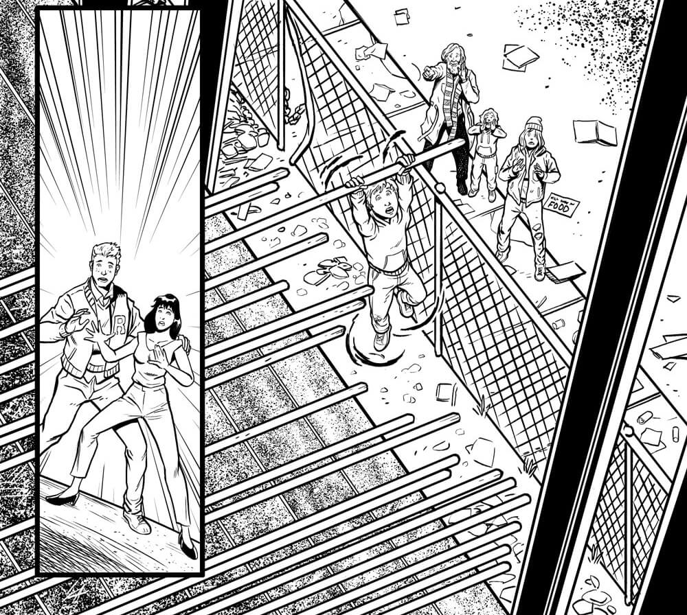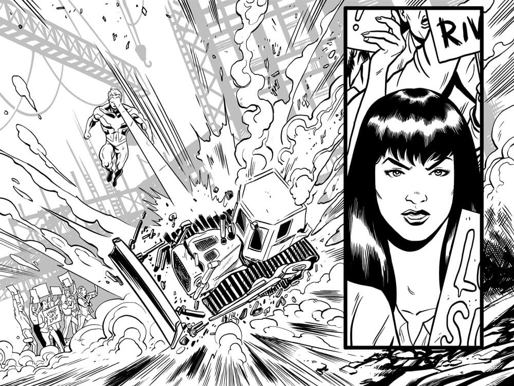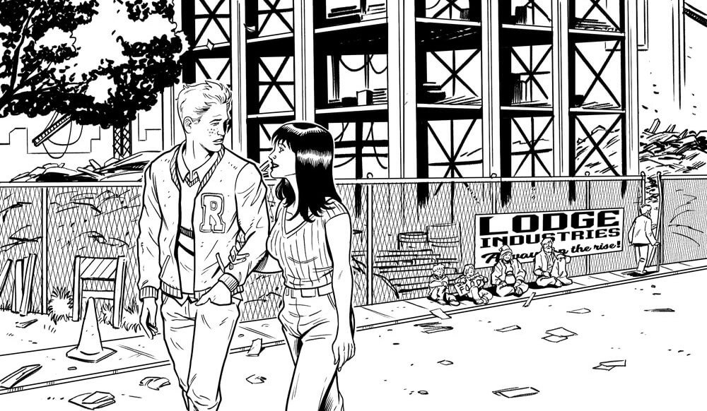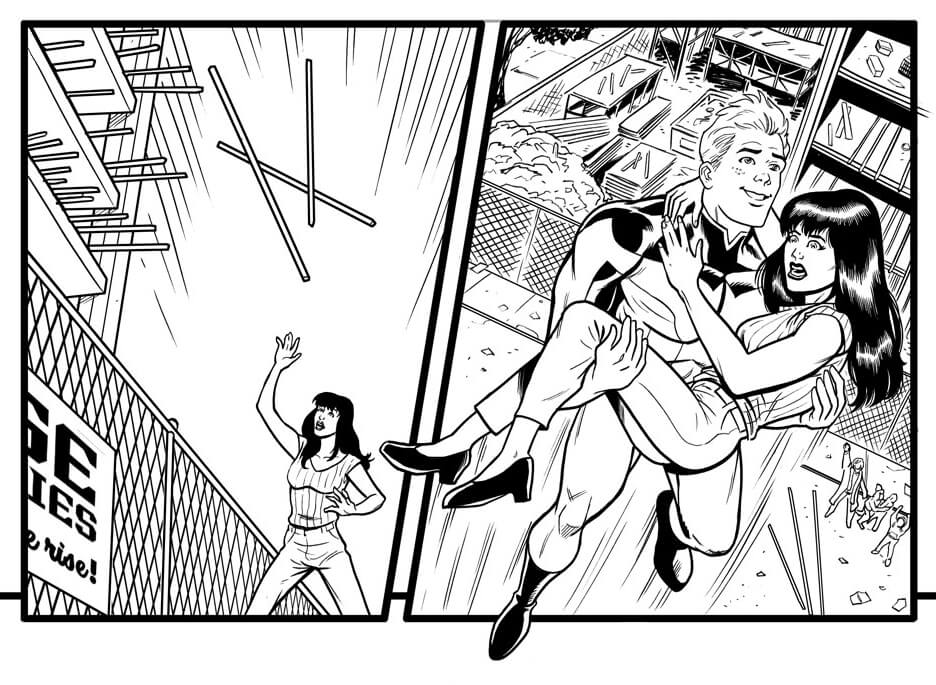 Archie Andrews has donned the cloak of justice in  Archie is…Mr. Justice #2. The multi-POV comic series presents Archie as a new kid in town who must cope with being a normal teenager and fighting crime at the same time. He’s attracted to Veronica Lodge, who doesn’t know Archie is also her dad’s fiercest detractor. In these exclusive black and white preview images, we see Archie and Veronica talking outside of a Lodge Industries Construction site – only to be interrupted by an emergency. Veronica in a lab, Archie rescuing Veronica – what on earth might be going on in issue 2?